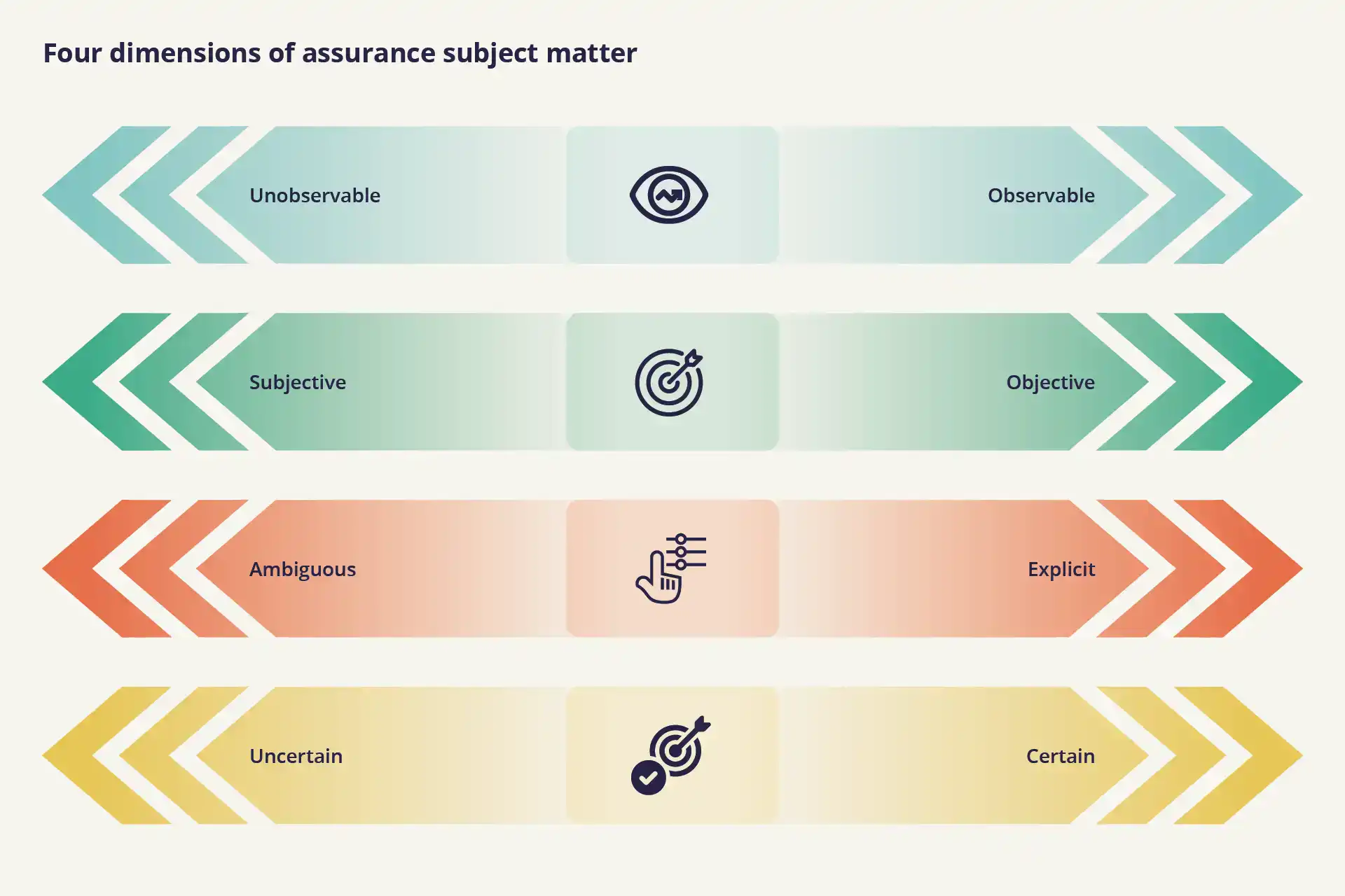 Figure 3. A graphic showing the four dimensions of assurance subject matter: unobservable/observable, subjective/objective, ambiguous/explicit, uncertain/certain.